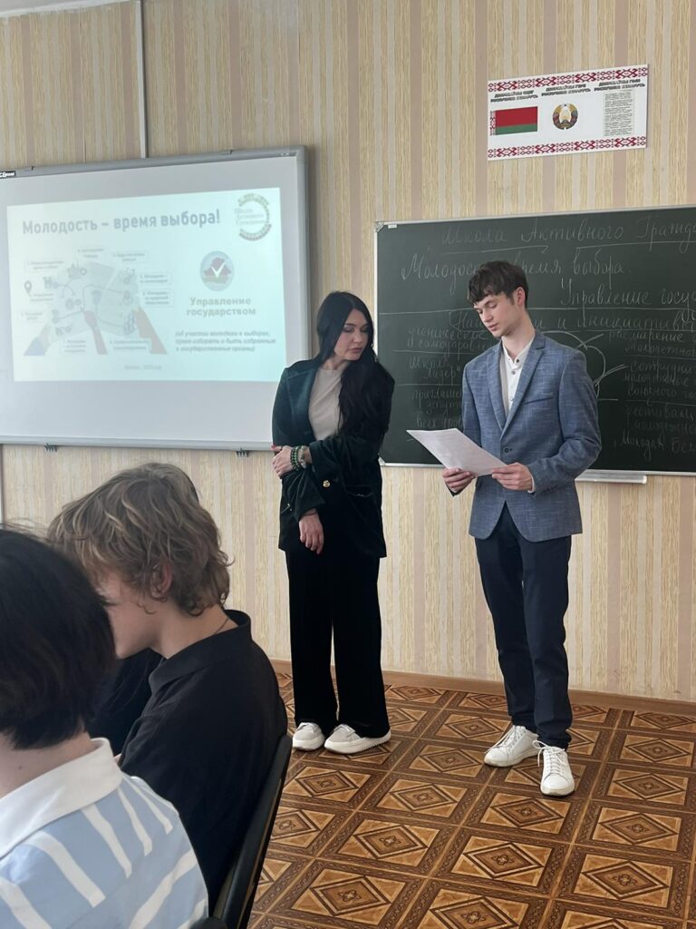 24.04.2025 г. в рамках информационно-образовательного проекта «ШАГ — Школа Активного Гражданина» для учащихся 8-11 классов было проведено мероприятие по теме: «Молодость — время выбора. Управление государством» (об участии молодежи в выборах, праве избирать и быть избранным в государственные органы). В ходе мероприятия на этапе ШАГ 1 при помощи интерактивной викторины «Мы узнаем» были актуализированы знания учащихся об участии молодежи в выборах, праве избирать и быть избранными в государственные органы власти. На этапе ШАГ 2 состоялось знакомство с нашим молодым земляком, лидером мнений, профориентатором филиала УО «Белорусский торгово-экономический университет потребительской кооперации» «Могилевский торговый колледж» Филимоновой Инной Михайловной. В ходе знакомства с молодым земляком, учащиеся имели возможность задавать вопросы приглашенному гостю. Учащиеся с интересом включились в обсуждение полученной в ходе беседы информации, с опорой на вопросы, сформулированные в соответствии с темой мероприятия. На этапе ШАГ 3 «Мы действуем» были подведены итоги при помощи системы вопросов, а также подготовлены предложения для составления «Дерева идей и инициатив» по теме мероприятия.
